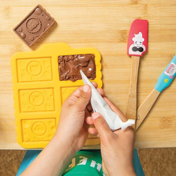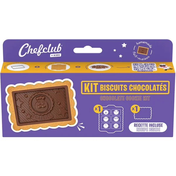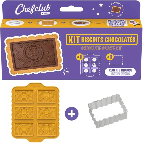 La star des biscuits rencontre la brigade Chefclub ! Ce set complet permet de réaliser les Petits Écoliers ® à l’effigie des personnages de la brigade Chefclub, 100% faits maison ! Un emportepièce en métal pour faire des biscuits (7 x 5 cm). Un moule à 6 chocolats en silicone. Recette de biscuits illustrée en pas-à-pas et en vidéo incluse. L’emportepièce et le moule passent au congélateur et au lavevaisselle.