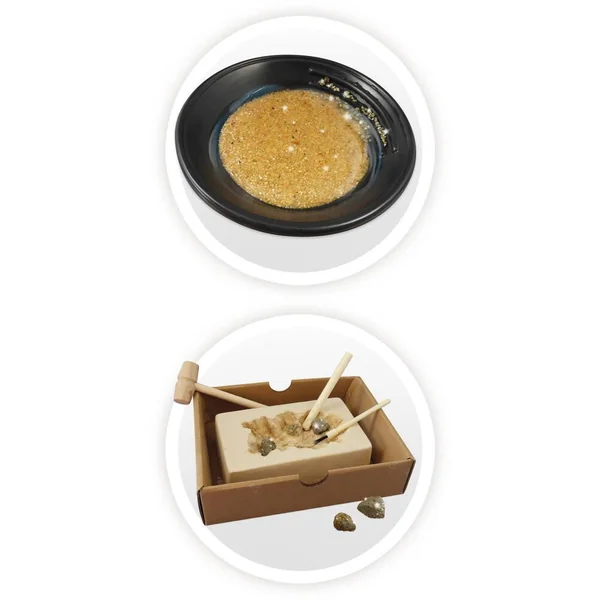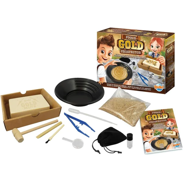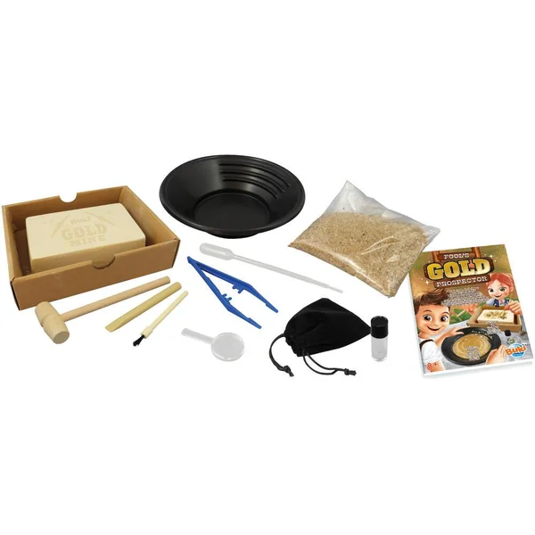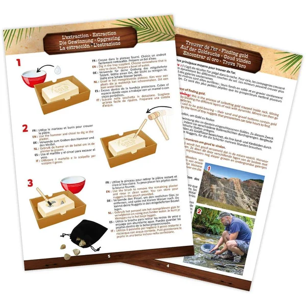 Deux techniques pour découvrir la prospection de l’or : l’orpaillage pour séparer le sable de l’or et le minage pour déterrer des pépites d’or des fous. De nombreux outils inclus : poêle, marteau, burin, pipette, pince… Notice illustrée en couleurs.