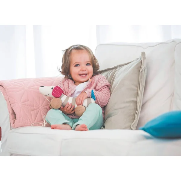 Découvrez le chien en tissu à tirer de Hape, un jouet d’éveil de la gamme des jouets à tirer pour les enfants. Ce petit chien à tirer est fait de différents tissus colorés et est très sage grâce à ses pattes à rouleaux silencieux. Il se laisse tirer en oscillant joyeusement d’avant en arrière.