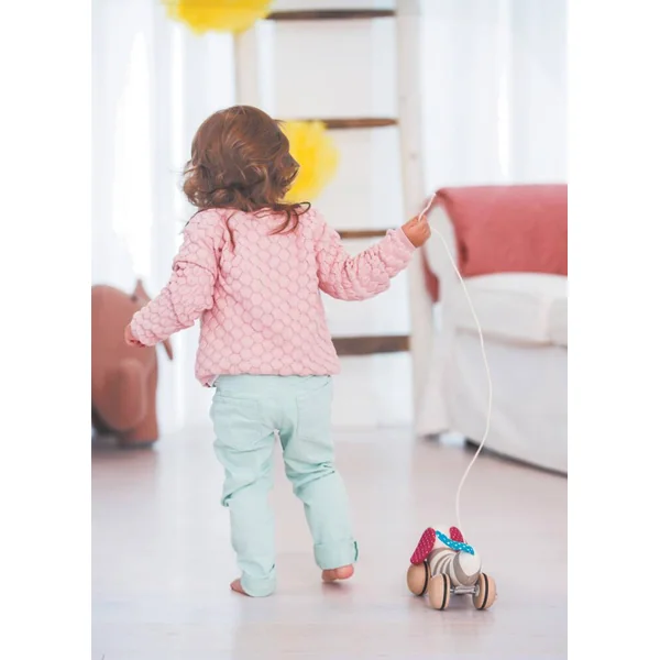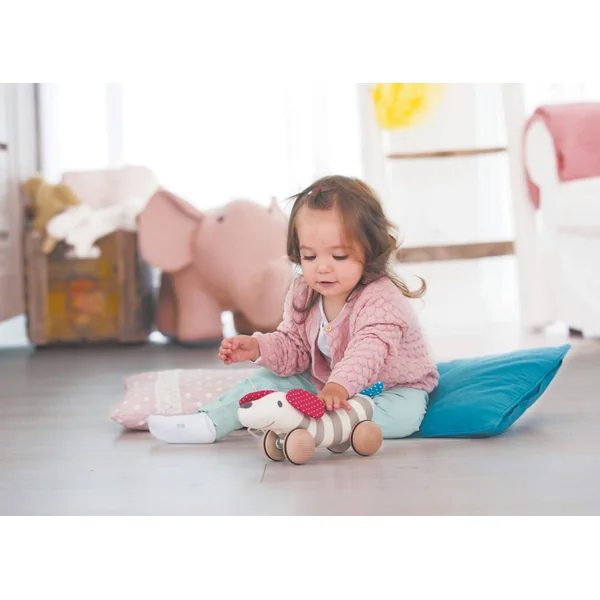 Vous apprécierez ses deux façons de jouer: Pousser/tirer, ou simplement un chiot en tissu à tenir. Ses oreilles tournent et les roues sont détachables.