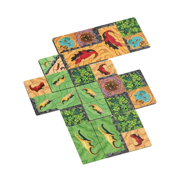 Le jeu comprend deux rangées de tuiles but et de tuiles dino. À chaque tour, les joueurs choisissent une tuile qu’ils ajoutent à leur arrangement personnel. Les tuiles de but restent sur le côté pour marquer des points en fin de partie, et les tuiles de dino sont disposées devant chaque joueur. Les tuiles dino comprennent trois tailles d’herbivores et de carnivores. Chaque tuile doit chevaucher les précédentes, soit sur un quart de tuile, une demi-tuile ou même une tuile entière, afin de s’assurer que les dinos recouverts sont complètement cachés.