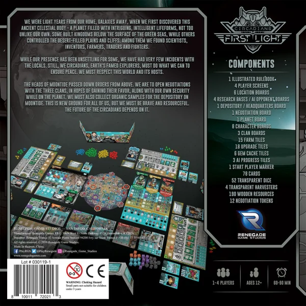 Embarquez pour un voyage interstellaire avec Circadians: First Light, un jeu de société captivant de Renegade Game Studios. Explorez un monde lointain peuplé de créatures fascinantes. En tant que Circadians, exploreurs renommés, votre mission est d’instaurer la paix, de gagner la faveur de trois clans et d’assurer votre sécurité sur cette planète mystérieuse.