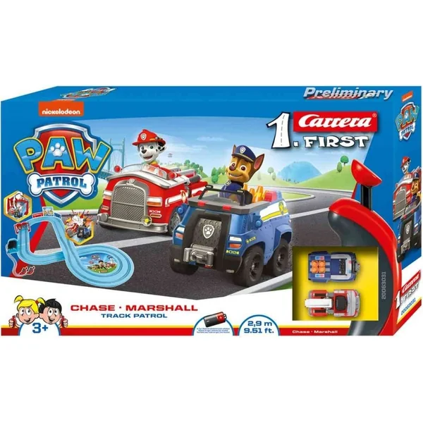 La piste de course Carrera FIRST de 2,9 m avec des voitures de la série Paw Patrol, pour les enfants à partir de 3 ans, fonctionnant sur batteries, comprend des lignes droites, un rétrécissement de la piste pour des collisions possibles, des virages, une porte tournante, des contrôleurs et des décorations sur le thème de Paw Patrol.