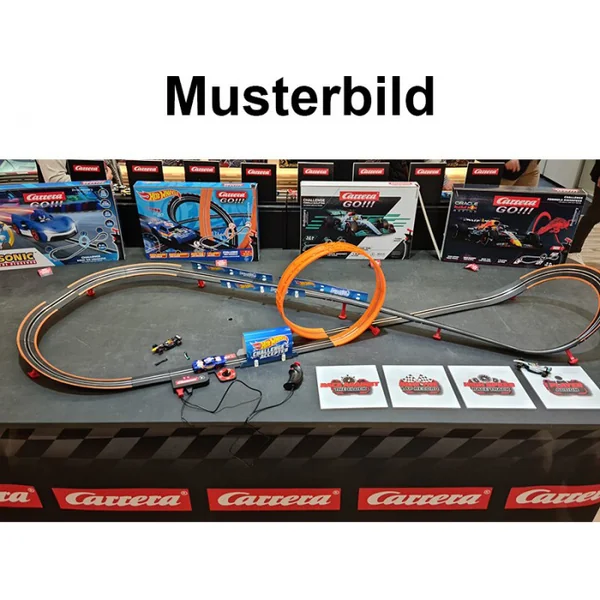 La piste de course Carrera GO!!! longue de 6 m avec une voiture Hot Wheels, comprend un looping, un virage incliné, un mur perpendiculaire, des lignes droites, des virages, un segment avec compteur de tours et d’autres pièces. Vous pouvez assembler d’autres pistes variées selon votre imagination. Une piste, une voiture, une manette.