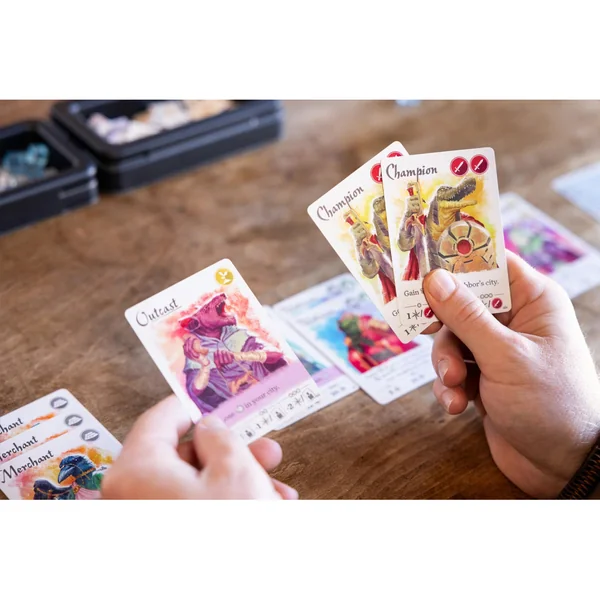 Récupérez des cartes Citoyens depuis le centre de la table vers votre espace de jeu. Activez leurs compétences pour prendre l’avantage sur vos adversaires. Choisissez judicieusement le moment où vous agissez, car vos rivaux peuvent suivre votre action et activer leurs citoyens à leur tour !