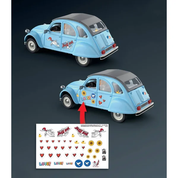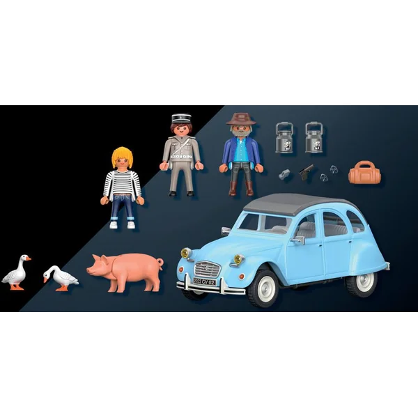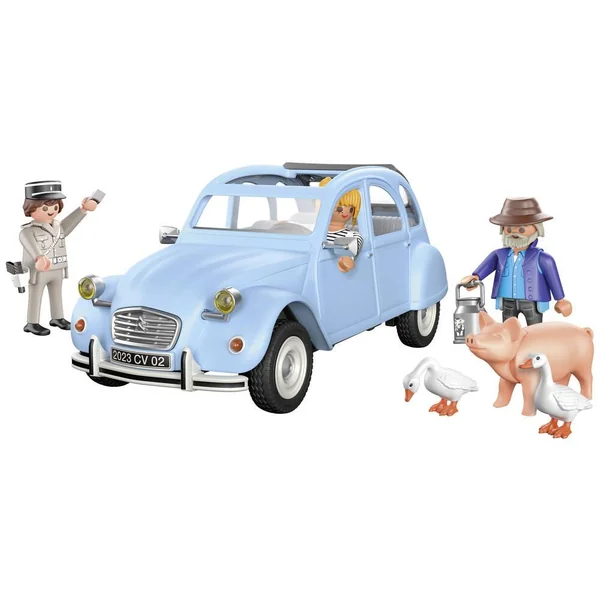 L’emblématique Citroën 2CV en version Playmobil ! Sillonnez les routes de campagne à bord de cette icône de l’automobile française. Personnalisez la voiture à grâce aux autocollants fournis pour créer un modèle unique. Contient 3 personnages (un gendarme, un homme et une femme), des animaux (des oies et un cochon) et des accessoires (un sac de voyage, des stickers). Le coffre est amovible ainsi que le toit pour placer les personnages dans la voiture. 57 pièces.