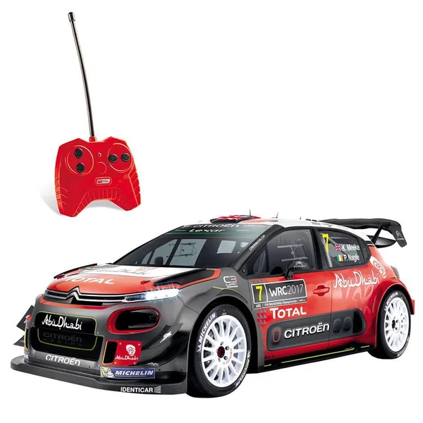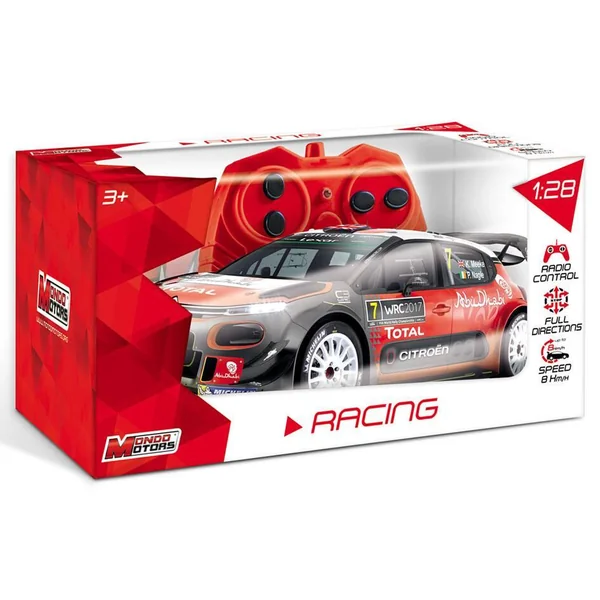 Réplique radiocommandée de la Ciroën C3 WRC. Commande toutes directions : avant, arrière, gauche et droite. Vitesse : 8km/h. 2 fréquences. Carrosserie Lexan Body. Echelle : 1/28ème.