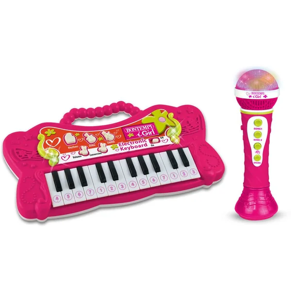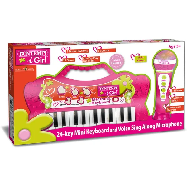 Clavier électronique de 24 touches • 25 démos • 3 sons • 2 rythmes de batterie • Any Key Play • Sélecteur notes/démos/Any Key Play • Réglage du volume • Effets lumineux • Arrêt automatique • Alim.: 2 piles à 1,5V R6/AA (non fournies) • Dim: 300x175x32 mm – Micro pour la voix • 16 Démos • Effets sifflement et applaudissements • 8 Rythmes de batterie • Effets lumineux • Alim: 3 piles de 1,5V R6/AA (non fournies) • Dim.: 60x195x60 mm-