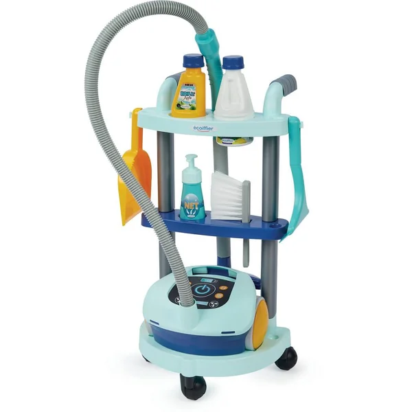 Chariot ménage comprenant 1 asiprateur traineau, 1 pelle et 1 balayette, 3 produits ménagers et 1 raclette à vitre.