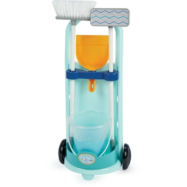 Chariot de ménage spécialisé dans le nettoyage du sol avec 1 balai, 1 pelle, 1 seau et 1 serpillère.