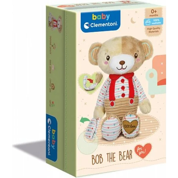 Le doux ours en peluche Bob deviendra immédiatement le compagnon inséparable de tous les petits enfants. L’ours est fabriqué à partir de différents matériaux textiles et textures et est conçu pour améliorer la stimulation multisensorielle de l’enfant. L’ours a une oreille pratique à laquelle il est possible d’attacher une tétine ou un anneau de dentition (la tétine et l’anneau de dentition ne sont pas inclus dans le produit). La belle boîte cadeau peut également être utilisée pour jouer avec l’ours en peluche.