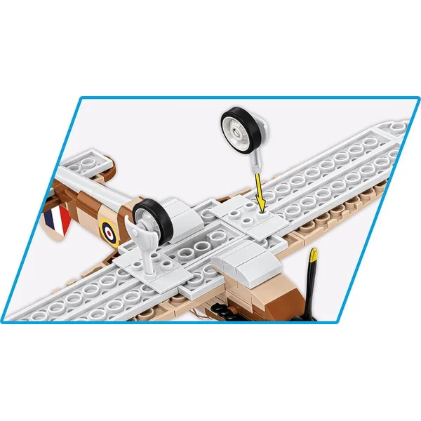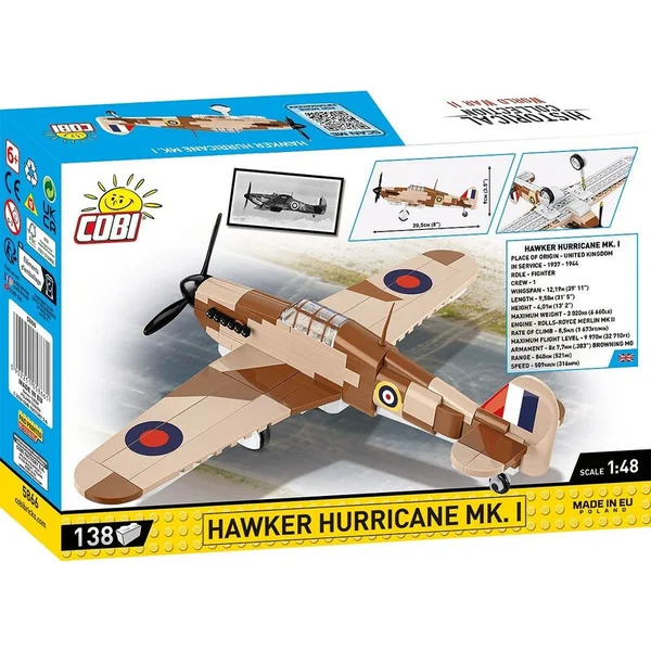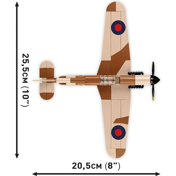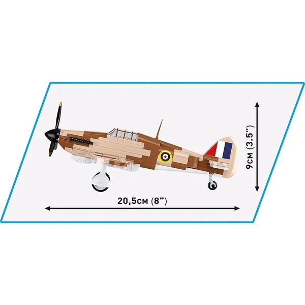 Un des chasseurs britanniques les plus populaires de la Seconde Guerre mondiale. Il s’est très bien comporté en action, faisant face aux Messerschmitt allemands. L’armement se composait de huit mitrailleuses Browning de 7,7 mm. Le modèle préparé par COBI a des couleurs faisant référence aux opérations en Afrique du Nord et en Méditerranée en 1940. L’avion, conçu à l’échelle 1:48, peut être construit à partir de 138 éléments avec impression marquée. L’avion mesure 20 cm de long et, une fois assemblé, a une envergure de 25,5 cm, ce qui le rend idéal pour être exposé dans une collection de passionnés d’aviation, ainsi que pour jouer. Grâce à ses dimensions compactes, il s’intègre facilement sur votre étagère ! Construisez l’histoire, pièce par pièce.