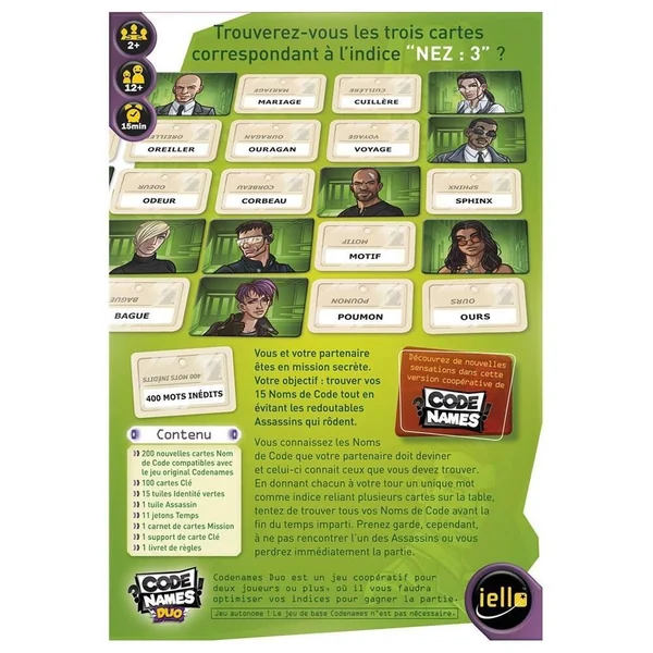 La version coopérative du célèbre jeu de Vlaada Chvatil ! Codenames Duo est un jeu coopératif pour 2 joueurs (ou plus) dans lequel vous devez retrouver tous vos Noms de Code avant la fin du temps imparti. Pour cela, vous devez, tour à tour, deviner ou faire deviner vos Noms de Code en donnant le meilleur indice possible. Prenez garde à ne pas tomber sur les redoutables Assassins qui rôdent ! Principe du jeu : Face à vous se trouve une carte clé recto verso. Chacun a alors devant soi 9 mots à faire deviner à son coéquipier dont 3 en commun. Parmi les trois assassins qui se trouvent devant vous, l’un d’entre eux appartient aussi au deux camps ! Chaque joueur connaît donc une partie des Noms de Code à trouver. Il va donc falloir coopérer pour trouver l’ensemble des Noms de Code avant la fin des 9 tours. Pour cela, chacun à votre tour, vous donnez un indice pouvant désigner plusieurs Noms de Code sur la table. Votre partenaire, quant à lui, tente de deviner ces Noms de Code tout en évitant de rencontrer l’un des terribles Assassins qui vous font perdre la partie. Trouvez l’ensemble des 15 Noms de Code avant la fin des 9 tours pour remporter la victoire. Points Forts : la version coopérative de la collection, des parties tendues du début à la fin, un mode campagne qui offre un vrai renouvellement du jeu. Duré et d’une partie : 15 minutes.