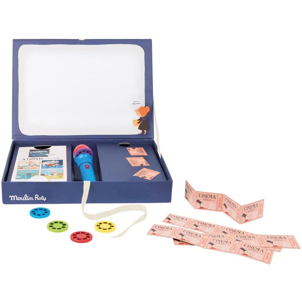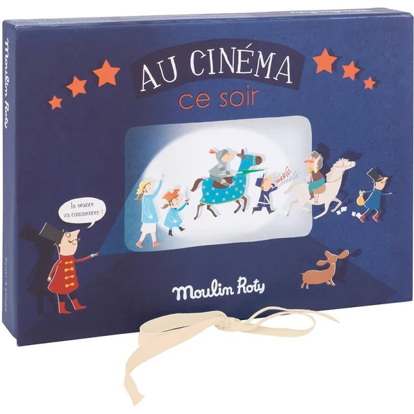 Le cinéma à la maison, demandez le programme! Coffret cinéma comprenant un bloc de programmes, des tickets de cinéma détachables, une lampe torche et cinq disques, de huit images, à emboîter. Chacun des disques projetés sur le mur raconte une histoire en couleur:- 1 : Arthur, vaillant chevalier : Il sauve sa belle princesse des flammes du méchant dragon- 2 : Au voleur ! : Deux gendarmes dans la ville sont à ses trousses, mais le voleur réussi à prendre la fuite en s’envolant, accroché à des ballons de baudruche- 3 : Super héros : Il vole au secours d’une mamie en proie aux flammes d’un immeuble- 4 : Sacré cowboy : Il devient le héros de sa famille, en apprenant à maîtriser sa monture, un cheval rebelle- 5 : Bande de pirates : Sur une île déserte et volcanique un bateau de pirates accoste pour découvrir le magnifique trésor. Mais oh surprise ! Il ne reste plus qu’une pomme à l’intérieur du coffre. Illustrations dans un style très années 50, un p’tit air à la Jacques Tati…Bonne séance !