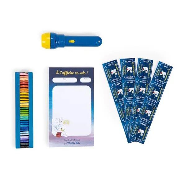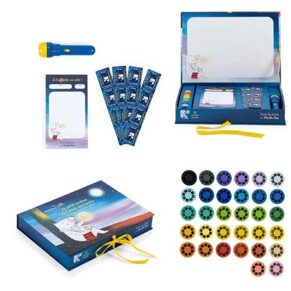 Le cinéma à la maison ! 32 histoires emblématiques de l’école des Loisirs à projeter réunies dans un coffret luxe, comprenant une lampe, 32 disques diapositives, un bloc de programmes et des tickets de cinéma pour partager laséance avec les copains….