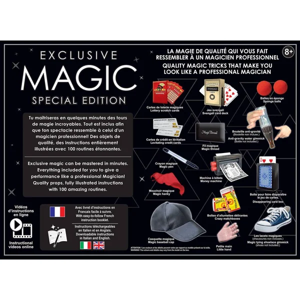 Le coffret inclut également des balles en mousse, des sacs en papier, et une machine à argent. Ces éléments vous permettront de réaliser une variété de tours fascinants, tout en développant la confiance en soi et la créativité des jeunes apprentis magiciens. Apprenez à manipuler les accessoires pour créer de véritables illusions et impressionner votre entourage. Avec un livret d’instructions en français facile à suivre. Instructions téléchargeables en italien et en anglais.