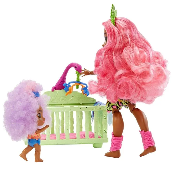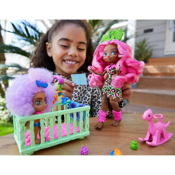 Fernessa prend soin d’un bébé aux cheveux frisés de couleur mauve. Ce ravissant bébé possède sa totote, un dino rose à bascule avec un socle pour le fixer, un lit à barreaux avec un mobile (bébé dino, ptérodactyles), une couverture, un oreiller, un livre d’histoires gravées et un panier en « pierre ». La poupée de 20cm de hauteur est incluse avec un bébé et plus de 10 accessoires sur le thème du maternage.