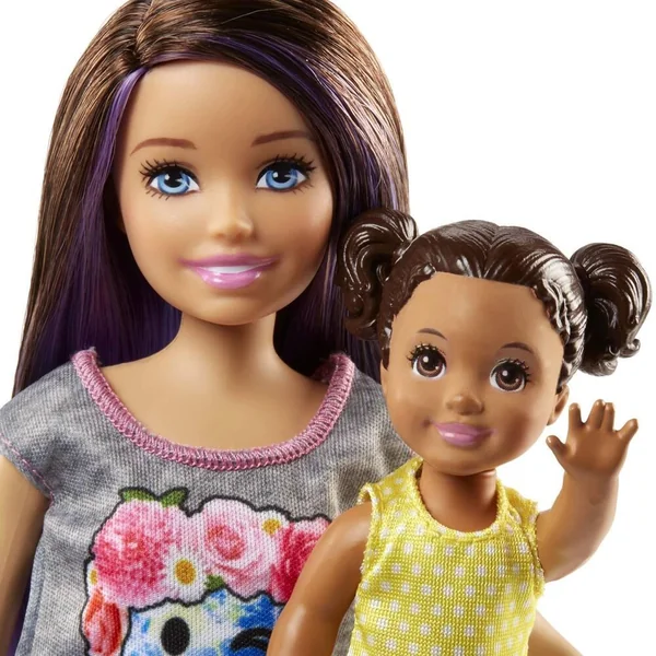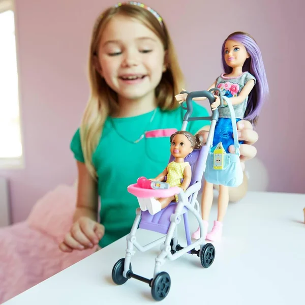 Coffret poupée et accessoires sur le thème du babysitting. Il se compose d’une poupée Skipper et d’une petite fille avec un jeu de changement de couleur (la bouche se salit). Une grande poussette et de petites pièces de complément sont incluses avec la poupée.