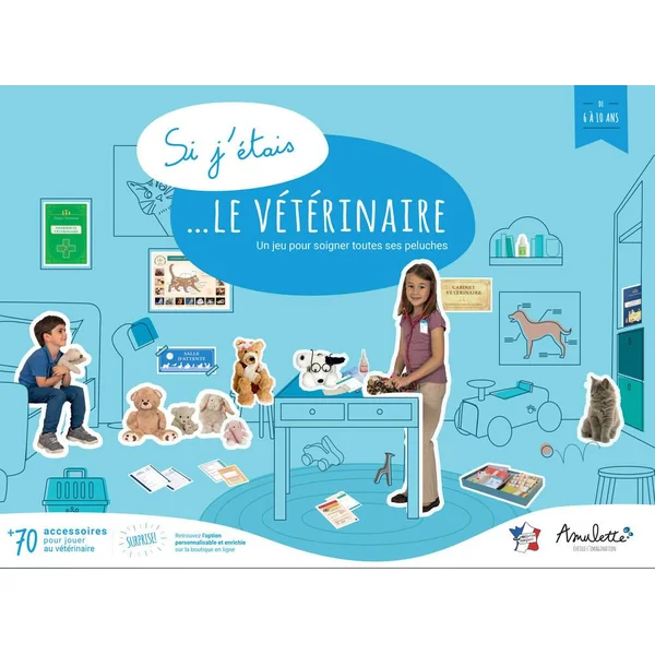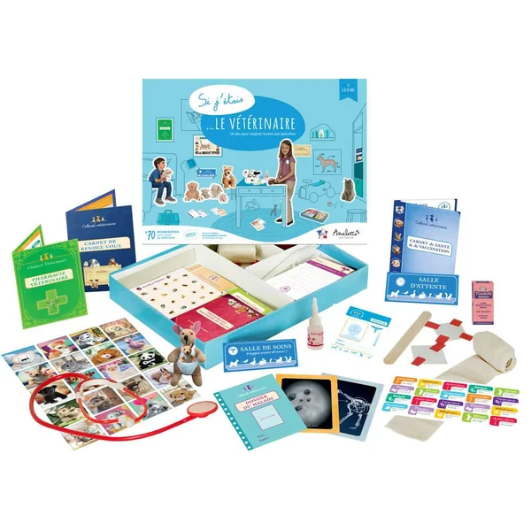 Un jeu pour transformer sa chambre en cabinet vétérinaire. 70 accessoires mignons et éducatifs, pour installer sa salle d’attente, bien soigner ses doudous avec les fiches amusantes, les bandes , les médicaments, les ordonnances et le stéthoscope qui fonctionne réellement.