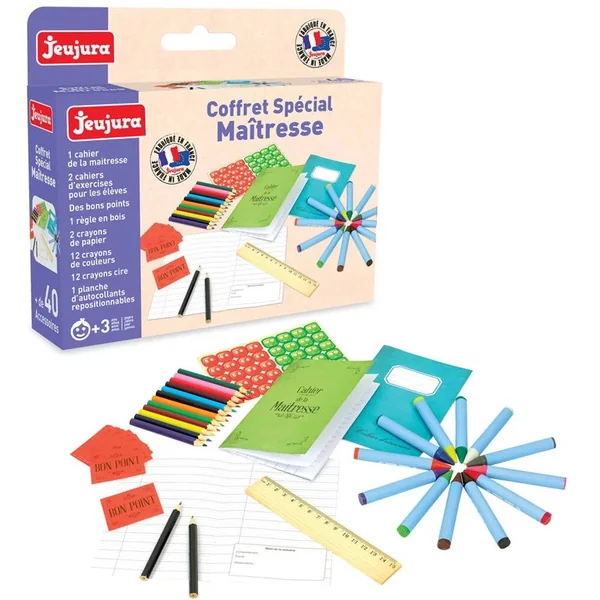 Coffret spécial maitresse : Pour s’amuser à jouer à la maîtresse et réaliser de très jolis dessins, ce coffret contient : 1 cahier de la maîtresse (avec emploi du temps et relevés de notes), 2 cahiers d’exercices pour les élèves, des bons points, une règle en bois, 2 crayons de papier, 12 crayons de couleur, 12 crayons cire, une planche d’autocollants repositionnables.