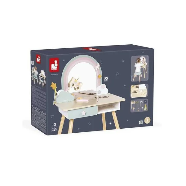 C’est le mobilier déco idéal pour une chambre d’enfant, dans son style mêlant bois brut et jolies couleurs, avec beaucoup de poésie et un bel arc-en-ciel, bien-sûr ! Chez Janod, les licornes sont astucieuses et usent de magie pour garder leurs secrets. Impétueuses et iconiques, elles évoluent dans un univers poétique, aux couleurs intemporelles. Cette coiffeuse licorne est composée de bois issu de forêts gérées durablement, certifié ***. Alors, saisissez la baguette magique et donnez un coup d’éclat à votre look du jour !