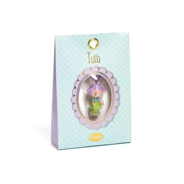 Un collier avec un pendentif représentant la figurine Tinyly « Tutti » finement sculptée sur une chaîne en métal colorée.