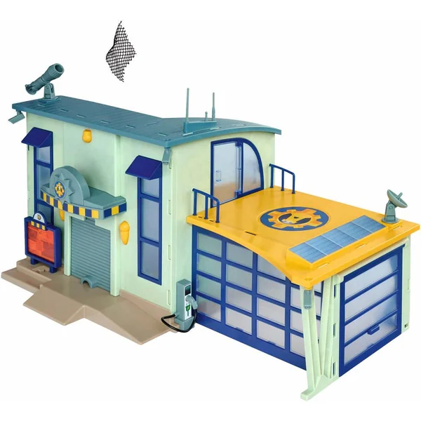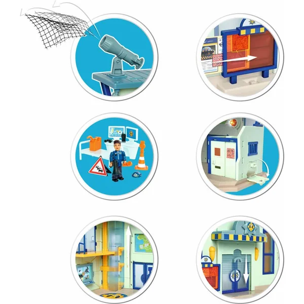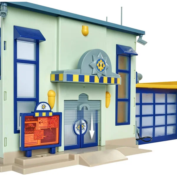 Playset représentant la station de police de la série « Sam le Pompier ». La station contient plusieurs fonctions de jeu et des fonctions sonores et lumineuses : une place de parking pour un 4×4, une cellule de prison avec trappe d’évasion, un ascenseur, une fonction alarme, un héliport… De nombreux accessoires ainsi qu’une figurine représentant Rose Ravani sont inclus.