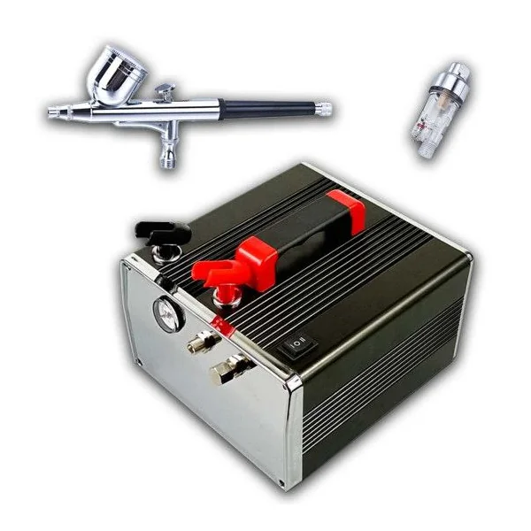 Compresseur silencieux + Aérographe + FiltreVous êtes passionné par la peinture à l’aérographe et recherchez un ensemble complet pour débuter ou améliorer votre équipement ? Ne cherchez plus. Ce kit comprend un compresseur silencieux, un aérographe double-action, et un filtre intégré pour garantir une application parfaite de vos peintures. Cet ensemble est conçu pour offrir une expérience de peinture optimale avec des outils de haute qualité. Caractéristiques du Compresseur Silencieux