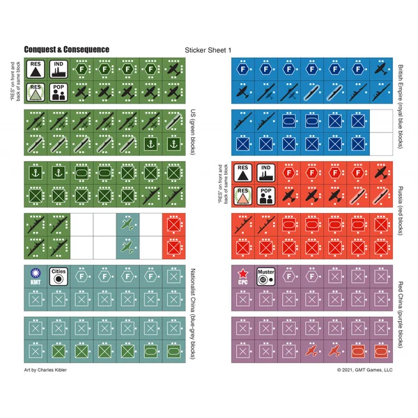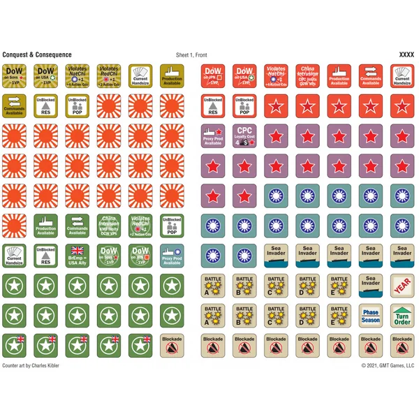 Les Chinois rouges viennent d’achever leur Longue Marche et ont rétabli leur base à l’intérieur du Shaansi, loin des zones d’intérêt japonais (ou capitaliste). Les Chinois rouges sont très faibles militairement mais disposent d’une arme secrète : les Partisans. Il s’agit d’organisations « politiques » non militaires (représentées sur la carte par des pions en carton) qui sont difficiles à éradiquer, se multiplient si on les ignore, et peuvent être converties en unités militaires quand on le souhaite (ce qui n’est pas conseillé sans une concentration suffisante). L’Union Soviétique, également très consciente de l’expansionnisme japonais, fortifie désespérément la Sibérie orientale, qui est par ailleurs peu défendue.