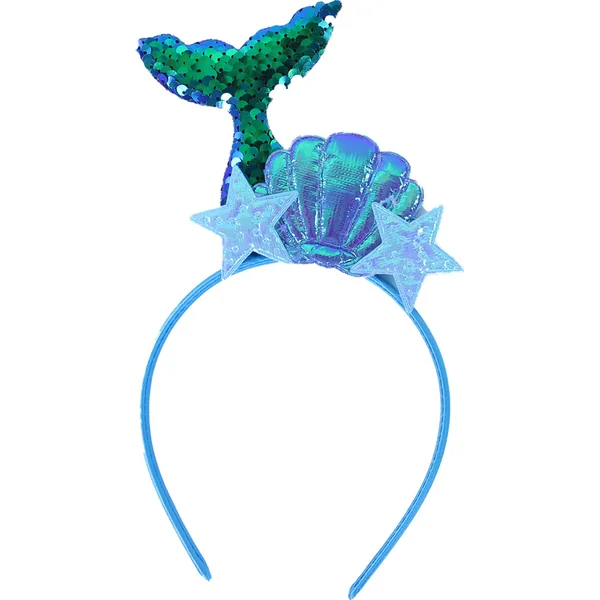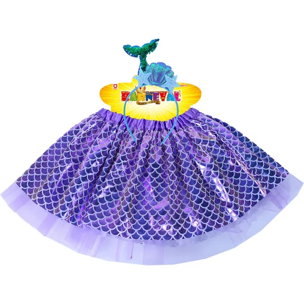 - Une jupe en tulle bouffante de couleur rose et bleue avec un imprimé d’écailles, accompagnée d’un serre-tête avec un motif de poisson.
