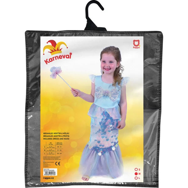 L’emballage contient une robe exclusive ornée de paillettes qui ressemblent à des écailles, le costume comprend une baguette.