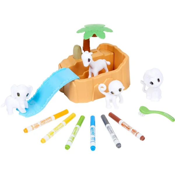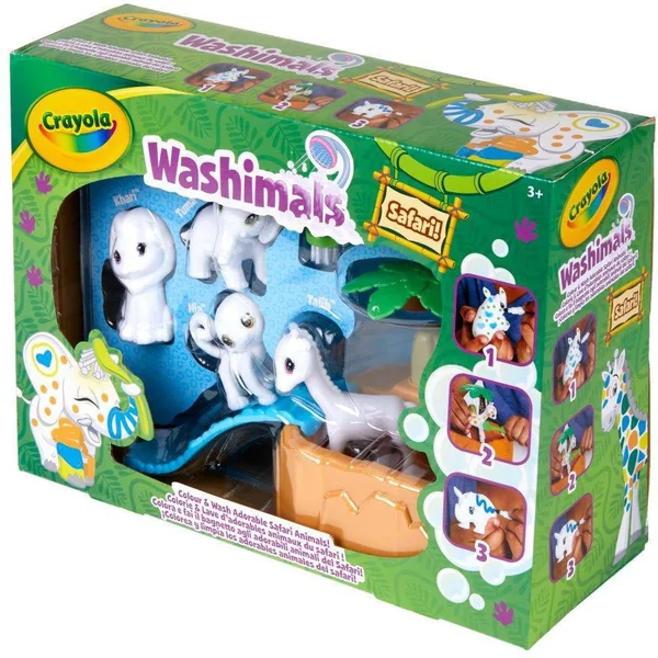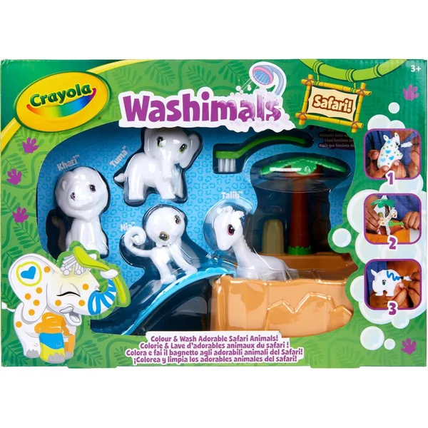 4 adorables animaux inédits à colorier à l’infini (animaux lavables) sur le thème du safari. Contient : 6 feutres, 1 baignoire avec pompe à eau, 1 brosse.