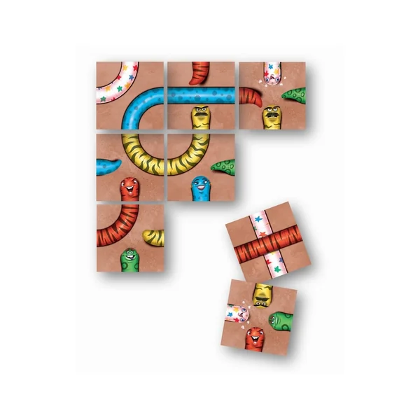 La règle est simple : celui qui a aperçu un ver en dernier prend une tuile « ver » de l’une des trois piles disposées au centre de la table et tente de l’ajouter au plateau de départ. La contrainte : la tuile doit être posée directement à côté d’une tuile déjà en place, jamais en diagonale. Les couleurs des segments de vers adjacents doivent absolument correspondre. Il existe quatre couleurs différentes et un ver licorne multicolore qui joue le rôle de joker. Et bien sûr, chaque ver ne peut avoir qu’une seule tête et une seule queue. Une fois la tuile posée, c’est au joueur suivant de jouer.