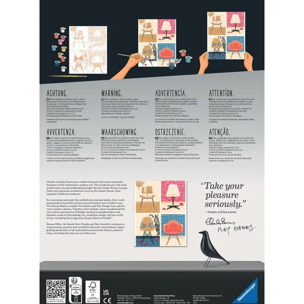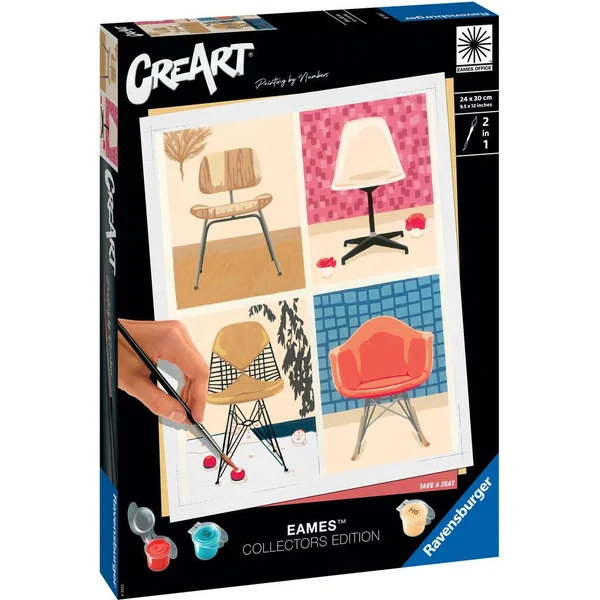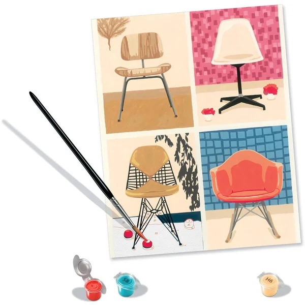 Profitez d’un moment de détente et de relaxation avec la peinture par numéros ! C’est facile, beau et agréable de réaliser soi-même son chef d’œuvre ! Parmi les visuels en grand format adulte à peindre et à accrocher, ce visuel design emblématique sur les célèbres chaises du designer EAMES saura ravir les passionnés et compléter leurs collections ! A partir de 12 ans. Ce produit est composé de matériaux issus de forêts bien gérées certifiées FSC®, de matériaux recyclés et de matériaux issus d’autres sources contrôlées (FSC-C111262).