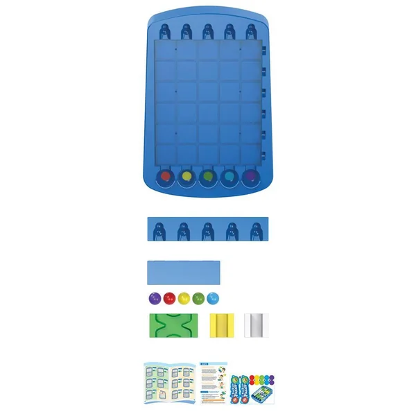 Jeu de réflexion et de logique. Avec un plateau de jeu, des pièces en plastiques et 10 billes en plastique. But : conduire toutes les billes de la ligne de départ au point d’arrivée. Résous l’énigme et fais rouler la bille. Un jeu amusant qui développe le raisonnement logique, encourage la résolution de problèmes et améliore la concentration. 2 modes de jeu possibles : 1 – crée le parcours à ta façon et fais rouler les billes, 2 – recrée un des 60 parcours proposés dans le livret pour résoudre le problème et faire rouler les billes. 60 problèmes proposés. 6 niveaux de difficultés. Contenu détaillé : 1 plateau de jeu, 1 pièce de départ, 2 blocs tunnel, 10 billes (2 de chaque couleur), 12 pièces avec croisement, 3 pièces droites de couleur jaune, 12 pièces droites de couleur blanche, 1 livret de problèmes, des instructions et des autocollants.