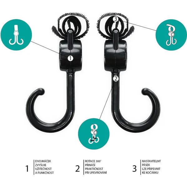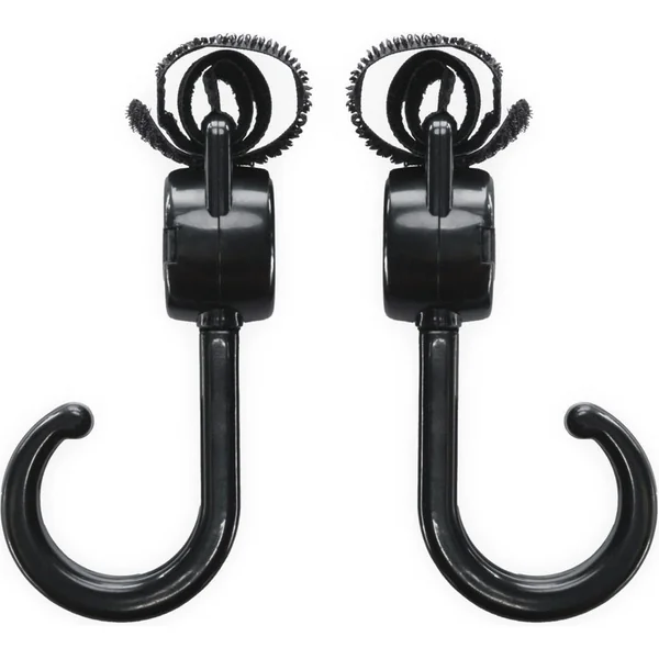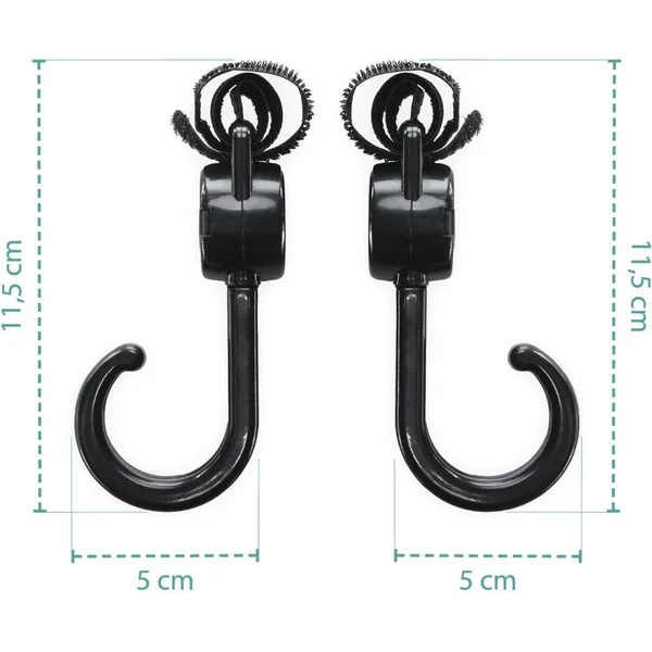 - Avec le crochet, vous pouvez attacher tout ce qui ne rentre pas dans le panier ou le sac classique de la poussette au guidon de la poussette.