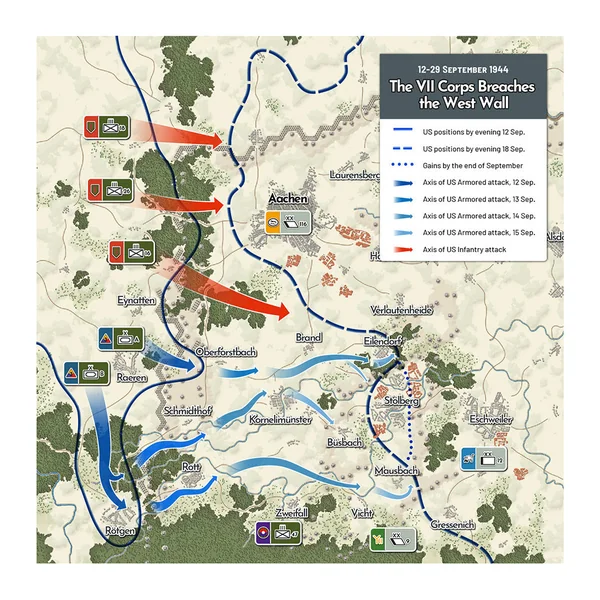 Alors que l’opération Market Garden est en phase finale de préparation, le lieutenant général Hodges dirige les éléments de tête de la Première Armée vers la ligne fortifiée Westwall au sud d’Aix-la-Chapelle. En cas de succès, il pourrait avoir l’occasion de traverser la ligne fortifiée, de franchir la rivière Roer et peut-être d’atteindre le Rhin.