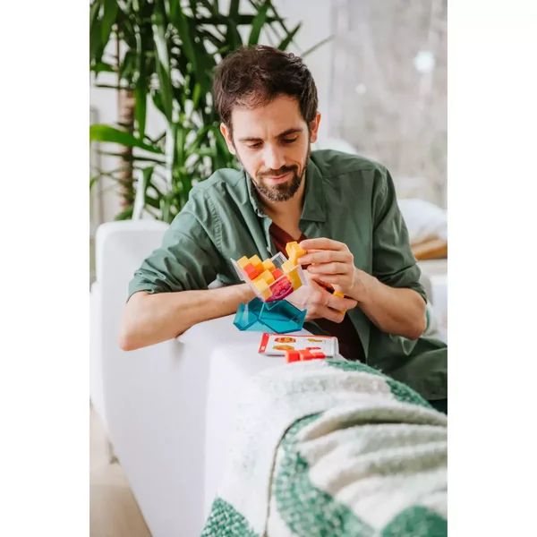 Construisez l’aire de jeu en insérant le demi-cube transparent dans la base bleue.