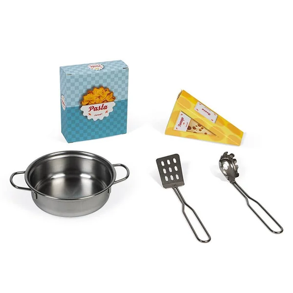 Pour devenir un grand chef, cette cuisine en bois brut et aux tons gris/bleus est équipée de nombreux accessoires : une patère pour suspendre la cuillère à spaghettis et la spatule en métal, accompagnées d’une casserole en métal et de 2 Boîtes d’aliments en carton, les indispensables pâtes et fromage.