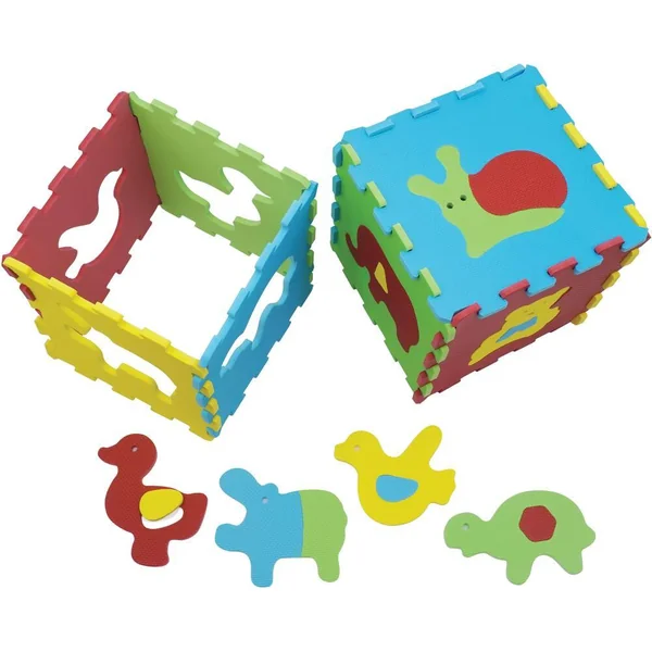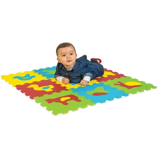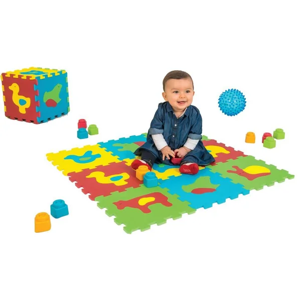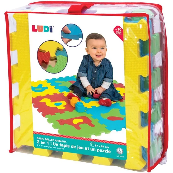 Découvrir confortablement en toute sécurité Les dalles « Basic Animaux » de LUDI isolent du froid, amortissent les chocs, résistent aux petites dents et stimulent la motricité fine de Bébé. Accrochées les unes aux autres, les 9 dalles offrent à Bébé un superbe tapis de jeu de 86,5 x 86,5 cm, idéal pour marcher à quatre pattes ou pour s’amuser avec ses jouets préférés ! Solides et confortables (épaisseur : 0,9 cm), les dalles s’encastrent les unes aux autres et assurent la sécurité de l’enfant.Apprendre tout en s’amusant ! Malin, des animaux composés de différentes formes rondes et colorées offrent une activité d’encastrement, en plus du puzzle ! Les différentes couleurs toniques encourageront la motricité fine et l’acuité visuelle de votre enfant tout en stimulant son imagination. Pour les plus grands, ne manquez pas l’occasion de retrouver le nom de chaque animal.Les dalles peuvent être utilisées en intérieur (fond de parc, tapis de jeu) comme en extérieur sur une surface plane et non glissante. Ce tapis est évolutif : les plus grands pourront s’exercer à réaliser le puzzle en 3D !Adaptées pour une utilisation dès la naissance.Aérer les mousse 48h avant leur utilisation.Dalles nouvelle génération avec un taux de formamide inférieur à 200ppm. Dalles composées à 100% d’EVA. Lavable à la main à froid et résiste à la déformation.