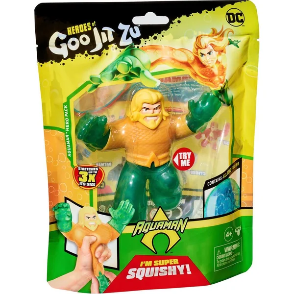 Redécouvrez Aquaman grâce à cette figurine de 11 cm, Goo Jit Zu Aquaman. Votre enfant sera ravi de retrouver son héros préféré comme il ne l’a jamais vu : dans une version ultra-extensible et 3 fois plus grande que les autres figurines. Cette figurine possède sa propre texture ainsi qu’un pouvoir spécifique, afin de retrouver l’univers d’Aquaman. Grâce à cette figurine extensible, votre enfant pourra laisser libre cours à son imagination et il s’amusera à inventer et à créer des aventures pour son héros. Il peut également reconstruire des scènes de ce superbe film.