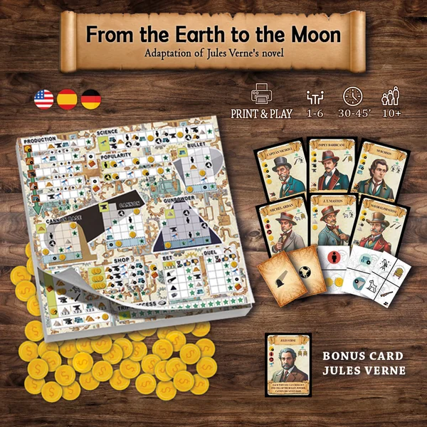 Ce jeu de plateau « flip & write » pour 1 à 6 joueurs représente l’essence même du roman. Il faudra collecter et produire des ressources, construire le canon, la base sur laquelle il repose et le boulet dans lequel voyageront les aventuriers. De plus, on y retrouve les mécanismes de pari et de duel, des concepts qui apparaissent à plusieurs reprises dans le roman.