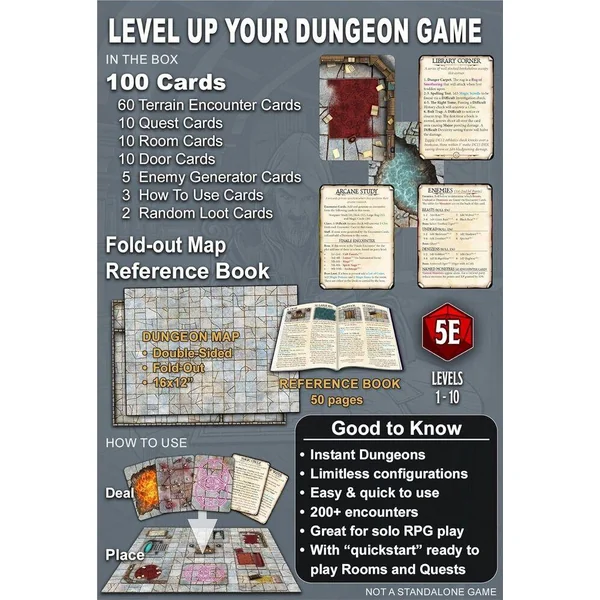Deck du concepteur de donjon Débloquez l’outil ultime pour les Maîtres du Donjon avec le Dungeon Designer’s Deck ! Ce jeu de 100 cartes est un compagnon rapide et flexible pour concevoir des aventures de donjon palpitantes et dynamiques pour 5E (facilement adaptable à d’autres systèmes). Que vous soyez un DM expérimenté ou un nouveau venu dans le monde du jeu de rôle sur table, ce jeu contient tout ce dont vous avez besoin pour créer des donjons captivants en un rien de temps. Caractéristiques principales : Terrain dynamique : 60 cartes présentent des éléments de terrain uniques et magnifiquement illustrés, plus 40 cartes d’intrigues, de salles, de portes et bien plus encore ! Rencontres aléatoires avec tables de roulement : Retournez chaque carte pour révéler une rencontre aléatoire adaptée au terrain. Création instantanée d’un donjon : Grâce à la carte recto-verso et au livre de référence, la création de donjons complexes n’a jamais été aussi simple et rapide. Des salles et des intrigues prêtes à l’emploi : À l’intérieur du paquet, vous trouverez des salles de donjon préconçues, des idées de rencontres et des intrigues prêtes à être intégrées à votre campagne. Parfait pour tous les niveaux de compétence des MJ : Que vous soyez un vétéran ou un débutant, le Dungeon Designer’s Deck est conçu pour simplifier le processus de création de donjons. Contenu : 100 cartes Livre de référence