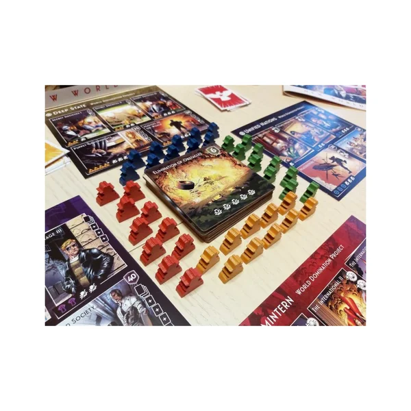 Pendant la phase d’action, chaque joueur effectue une action, dont la plus importante consiste à envoyer ses agents pour infiltrer des institutions politiques, financières et scientifiques représentées par des cartes d’objectifs dans la zone d’infiltration. Vous devez faire la course aux cartes « objectif » car les autres joueurs peuvent envoyer plus d’agents pour intercepter la carte dont ils ont besoin. Les joueurs peuvent également progresser vers des projets de domination du monde, notamment Comintern, Unified Nations, Spyware, et Deep State lui-même, ce qui donne aux joueurs des avantages tangibles dans le jeu. Ils peuvent également choisir de mener des opérations secrètes qui leur donnent beaucoup d’influence tout en exigeant le sacrifice d’agents.