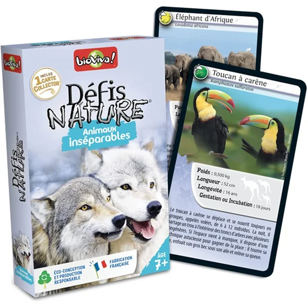 Le principe de Défis Nature – Animaux inséparables est simple : les enfants de 7 ans et + parient sur les points forts des animaux. Le joueur qui possède la plus forte caractéristique remporte les cartes des autres joueurs. Le premier à collecter toutes les cartes du jeu gagne la partie.