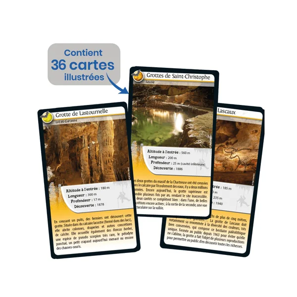 Le principe de Défis Nature – Grottes de France est simple : les enfants à partir de 7 ans parient sur les points forts des cavités. Le joueur qui possède la plus forte caractéristique remporte les cartes des autres joueurs. Le premier à collecter toutes les cartes du jeu gagne la partie.