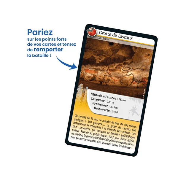 La grotte de Trabuc a une profondeur de 102 mètres… Peut-elle remporter la bataille contre la grotte de Lacave ? Oui ! La Grotte de Trabuc est plus profonde (La grotte de Lacave a une profondeur de 50 mètres) ! Attention, le degré de vulnérabilité du site peut retourner la situation lors des batailles ! Si la cavité d’un joueur est plus vulnérable que celle du joueur qui a ouvert la manche, il peut changer la caractéristique d’affrontement.