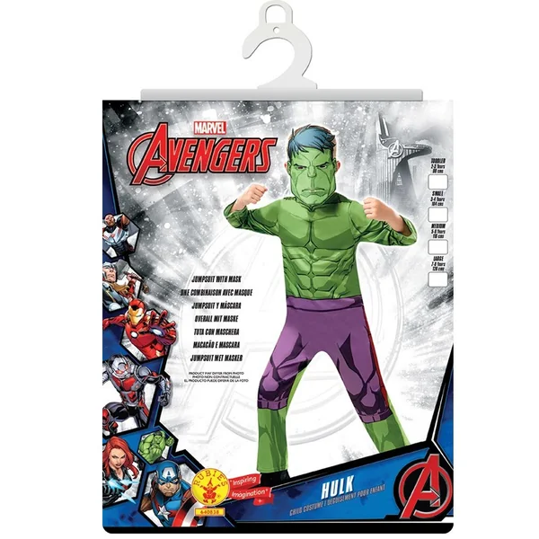 Un masque en mousse assorti à l’effigie de Hulk avec attache élastique à l’arrière et ouvertures pour les yeux.