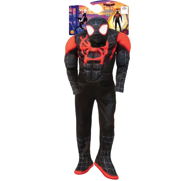 Une combinaison à manches longues en jersey imprimé noir et rouge avec muscles rembourrés et logo sur le buste.Des couvre-bottes en mousse intégrés.Une cagoule en jersey assortie à l’effigie de Miles Moralès/Spider-Man avec attache velcro dans le cou.