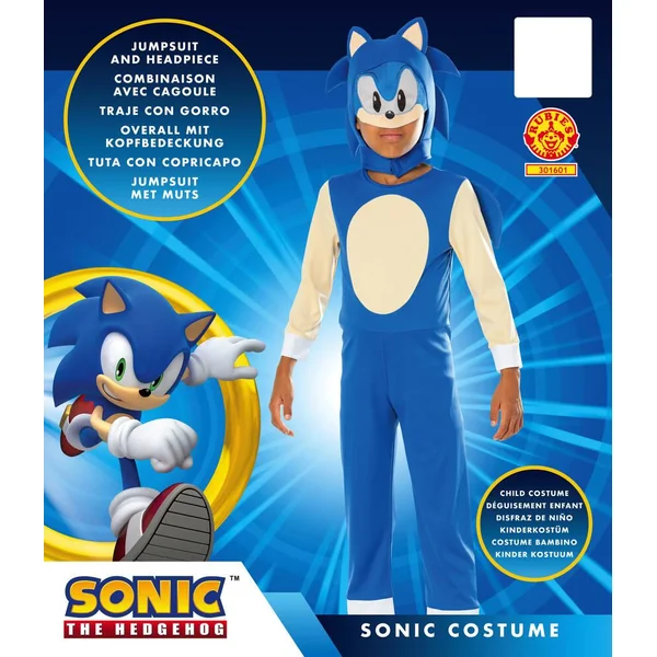 Une combinaison en jersey beige et bleue à manches longues avec épaulettes et queue rembourrées. Une cagoule rembourrée en mousse avec museau de Sonic, oreilles et attache velcro sous le menton.